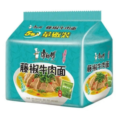 Kang Shi Fu offers a convenient 5-pack of artificial beef-flavored instant noodles featuring a rich, oily broth complemented by Sichuan green pepper spice notes, making it a flavorful and satisfying meal option.
